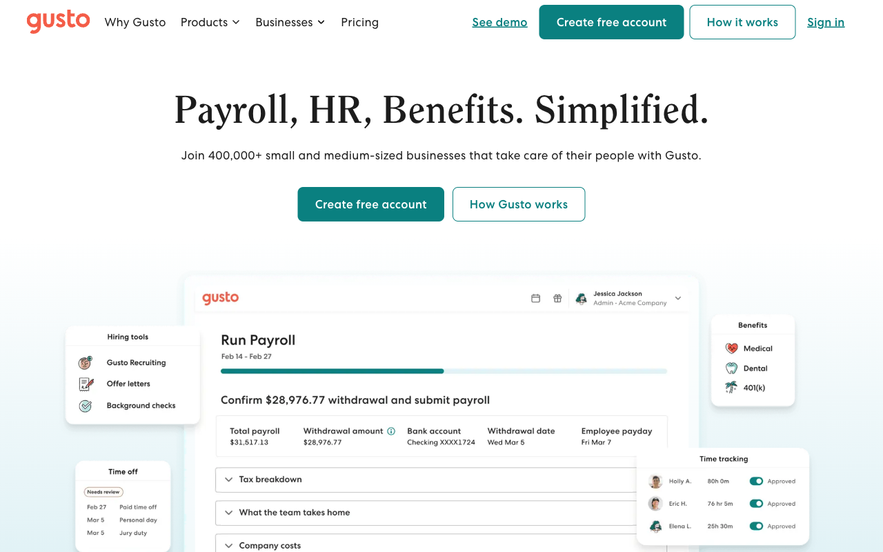 Gusto automates payroll, tax filing, benefits administration, and HR for 100,000+ small businesses — so you can stop spending Fridays on payroll and start running your company.